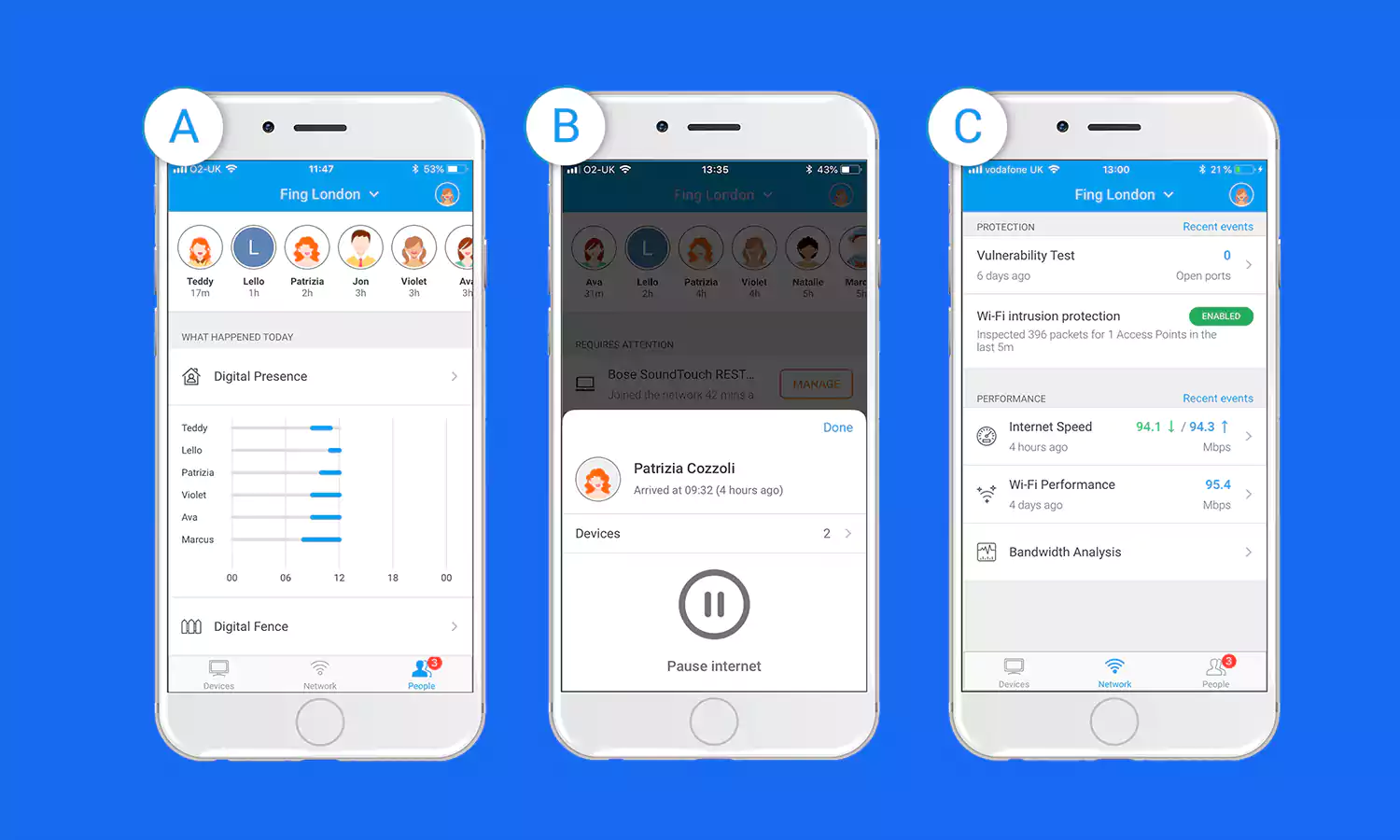 - برنامج Fing (لأندرويد وآيفون)، وهو عبارة عن تطبيق قوي ومجاني، وبمجرد قيامك بفتح التطبيق، سوف يعرض جميع الأجهزة المتصلة بالشبكة.