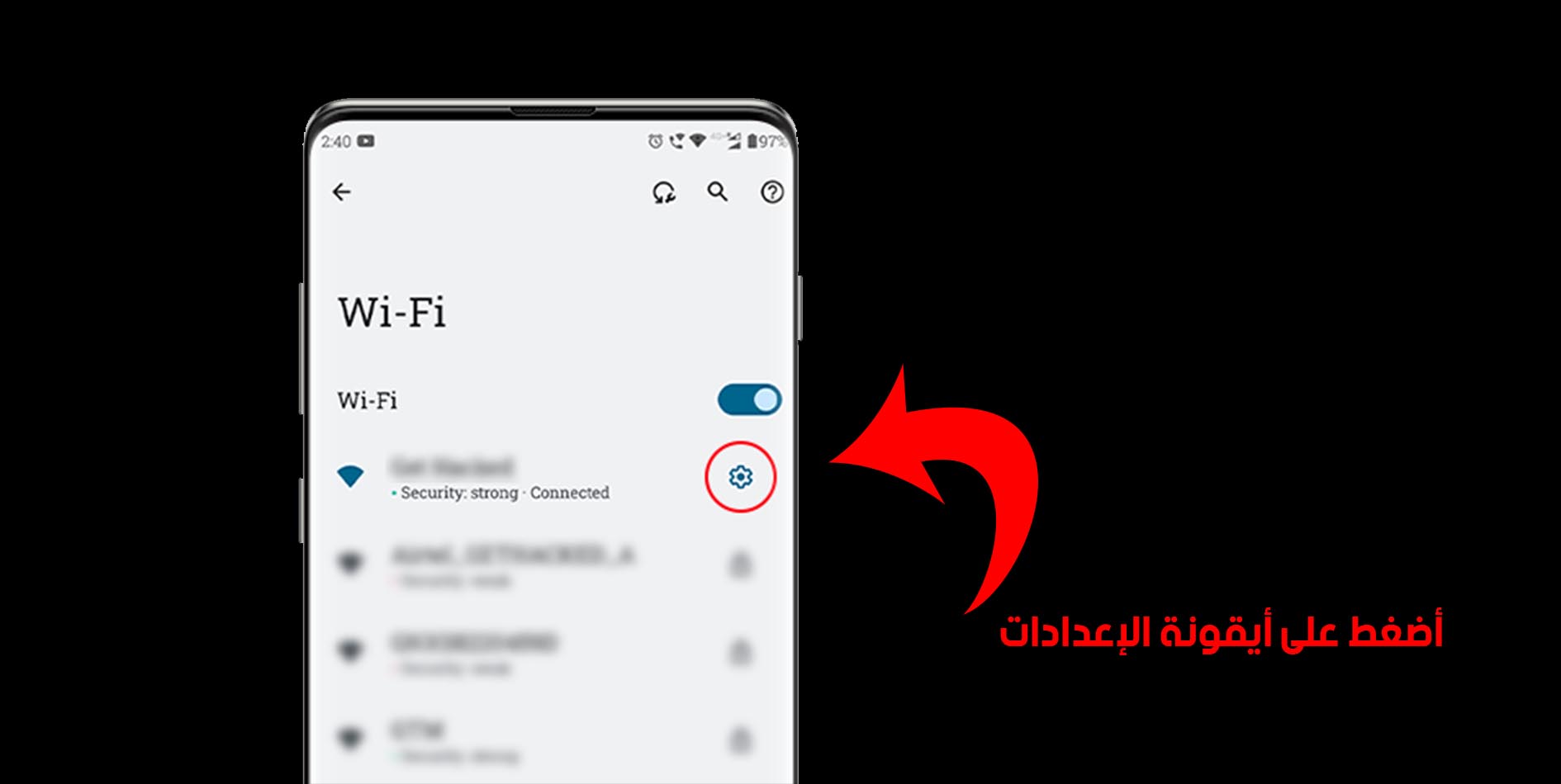 شبكة الواي فاي التي ترغب بالإتصال بها2. الخطوة 2 : اضغط على “الإعدادات” > “الشبكة والإنترنت” > “Wi-Fi”، > ثم اضغط على أيقونة الترس بجوار شبكتك.