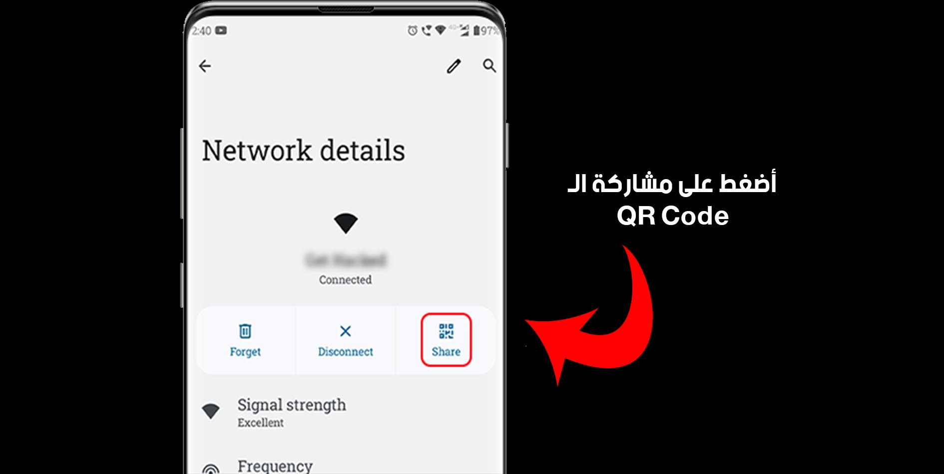 إعدادات الواي فاي3. الخطوة 3: انقر على “رمز الاستجابة السريعة”. إذا لم يظهر لك هذا الخيار، فانقر على زر “مشاركة” على اليمين. يجب عليك تأكيد ذلك باستخدام رقم التعريف الشخصي (PIN) أو بصمة الإصبع.